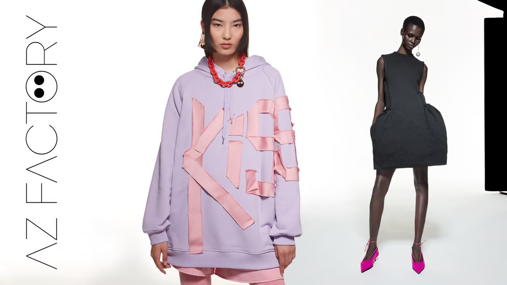 “Alber trouxe suas fitas de cetim com bordas rústicas com detalhes metálicos para peças que ele concebeu como uma resposta às necessidades do vestuário das mulheres da atualidade. Roupas de lazer que melhoram o humor são a mais recente adição ao guarda-roupa modular da AZ Factory, com peças que consistem em fornecer elegância e conforto”, acrescentou.
