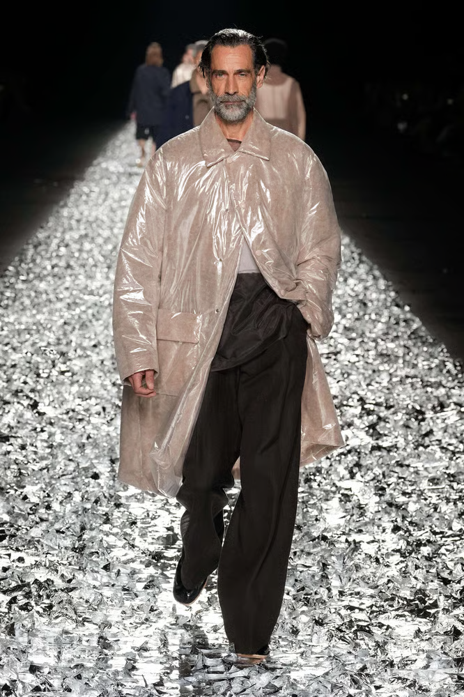 Mas em vez de reintroduzir os seus maiores êxitos, Van Noten ultrapassou os limites neste desfile, apresentando uma série inteiramente nova de tecidos metálicos iridescentes.