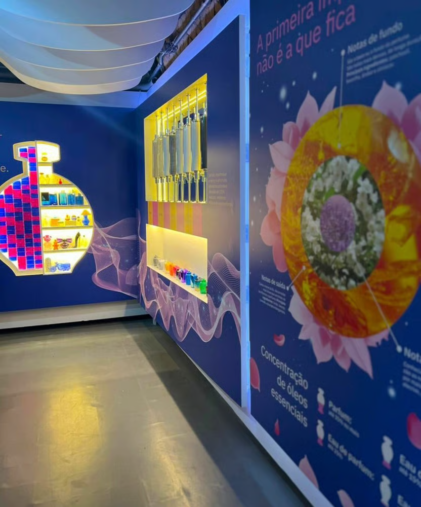 Distribuída em 100m², a exposição apresenta cerca de 300 itens, nacionais e internacionais, e ganhou ilustrações em papiro, totem para teste do olfato, além de conteúdo interativo, para continuar contando a história do perfume, desde a história do vidro até as técnicas mais modernas de extração. Também é possível aprender e criar a sua própria fragrância, através de telas touch screen e, ao final, conseguir sentir o aroma através do catálogo digital.